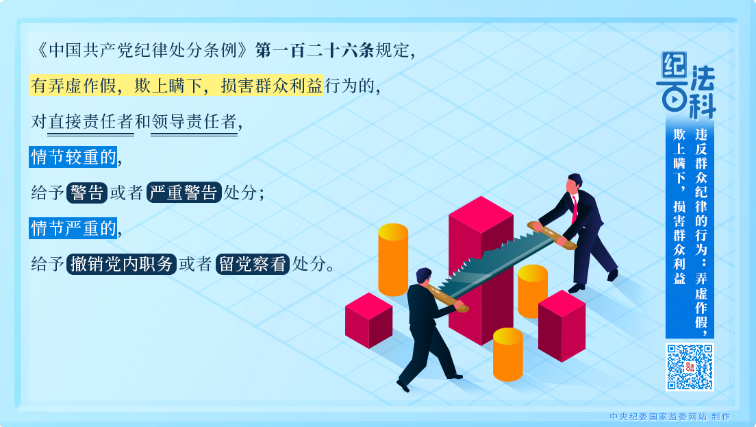 《中国共产党纪律处分条例》第一百二十六条规定,有弄虚作假,欺上瞒下,损害群众利益行为的,对直接责任者和领导责任者,情节较重的,给予警告或者严重警告处分;情节严重的,给予撤销党内职务或者留党察看处分。